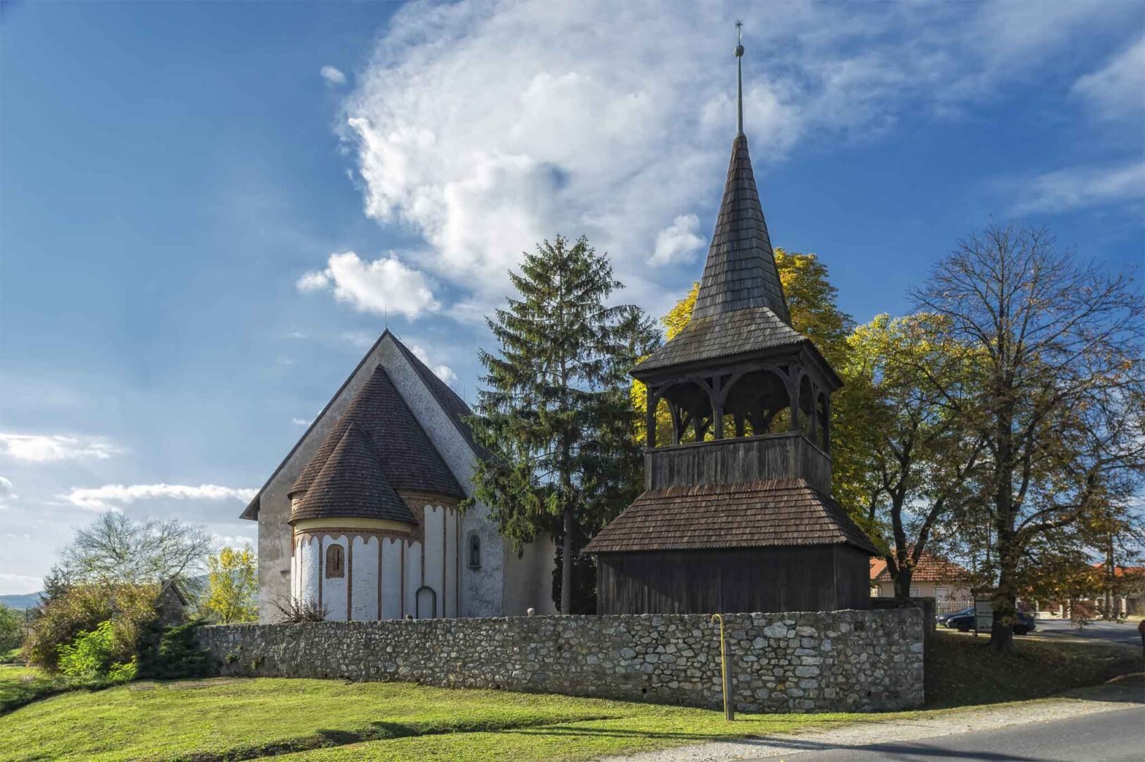A templom mellett áll egy 18. századi fa harangláb.